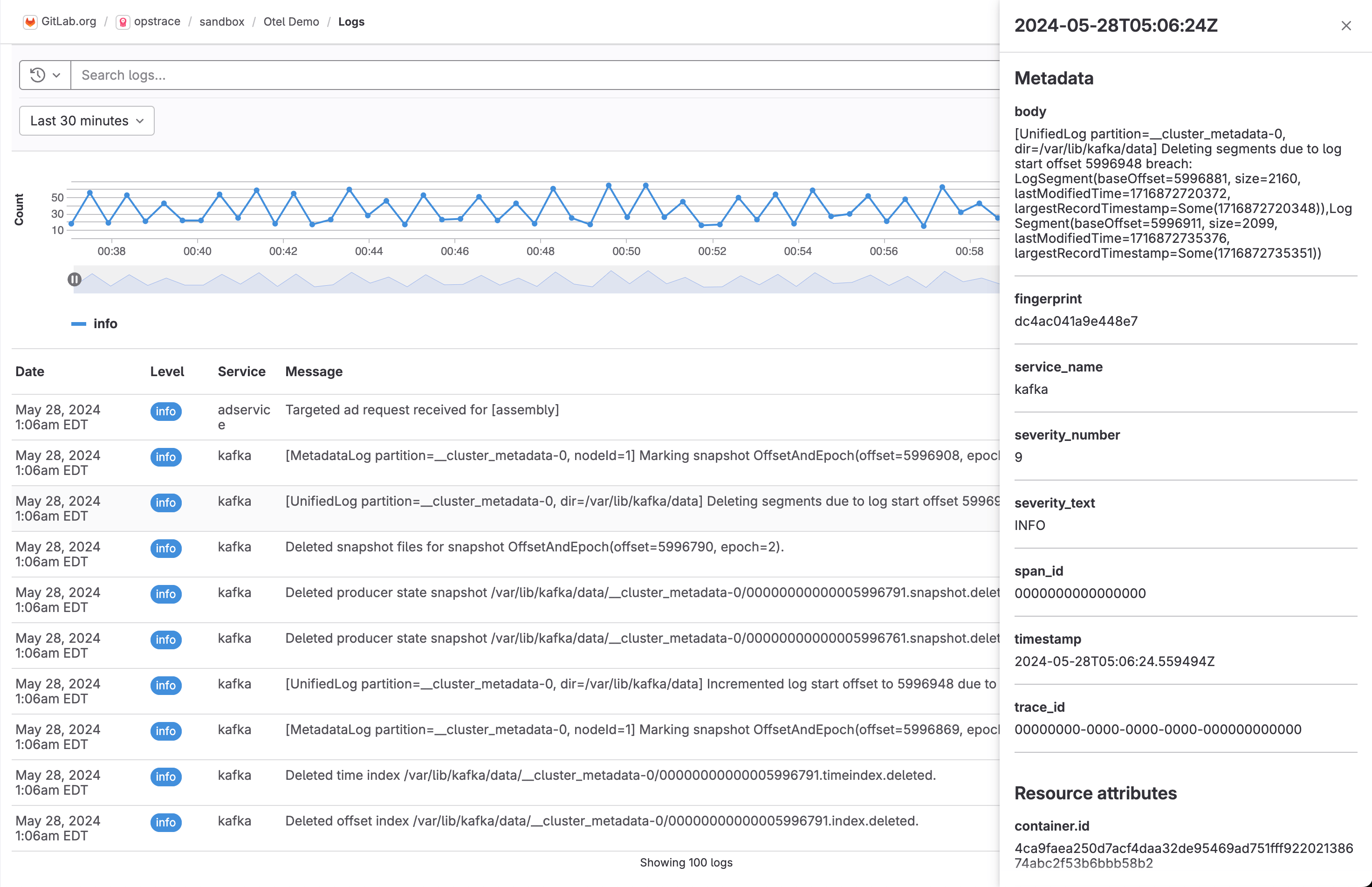 It is also possible to see log line details such as metadata and resource attributes.